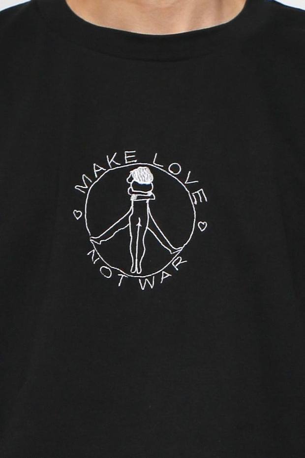 男女の裸体でピースマークを表現した落書きグラフィックを前後に刺繍。