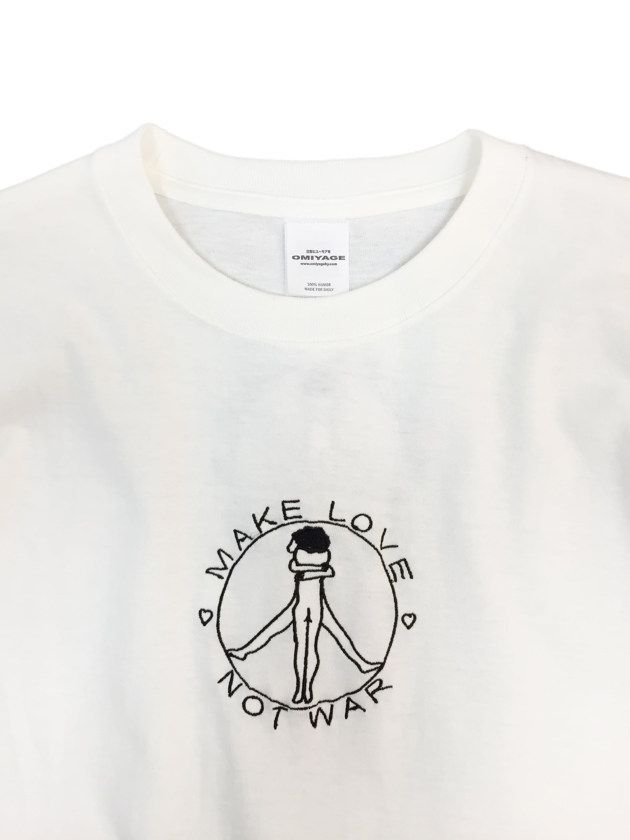 男女の裸体でピースマークを表現した落書きグラフィックを前後に刺繍されています。