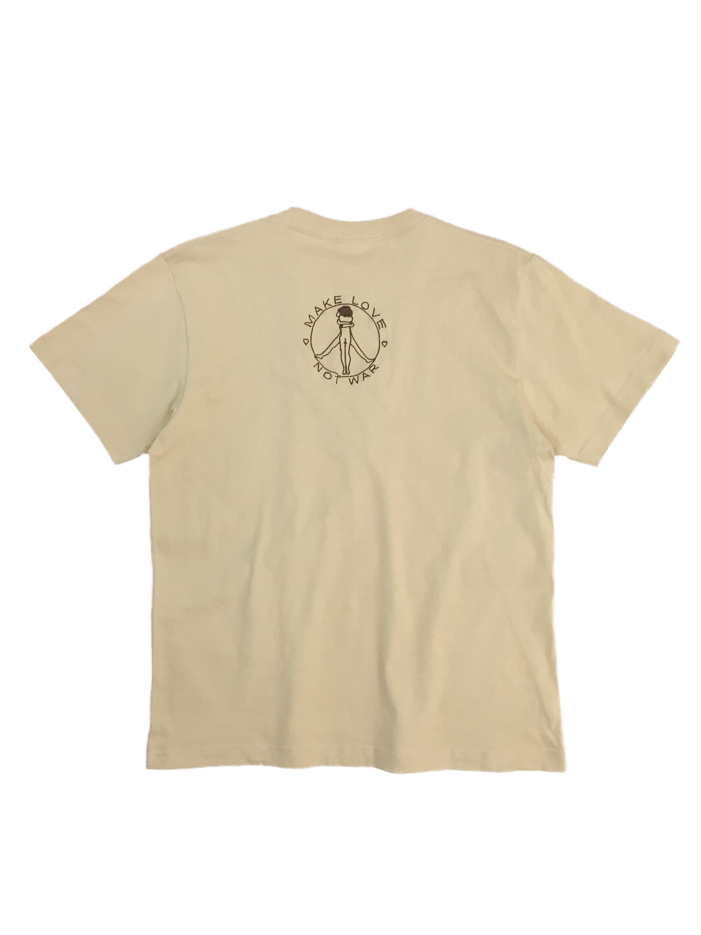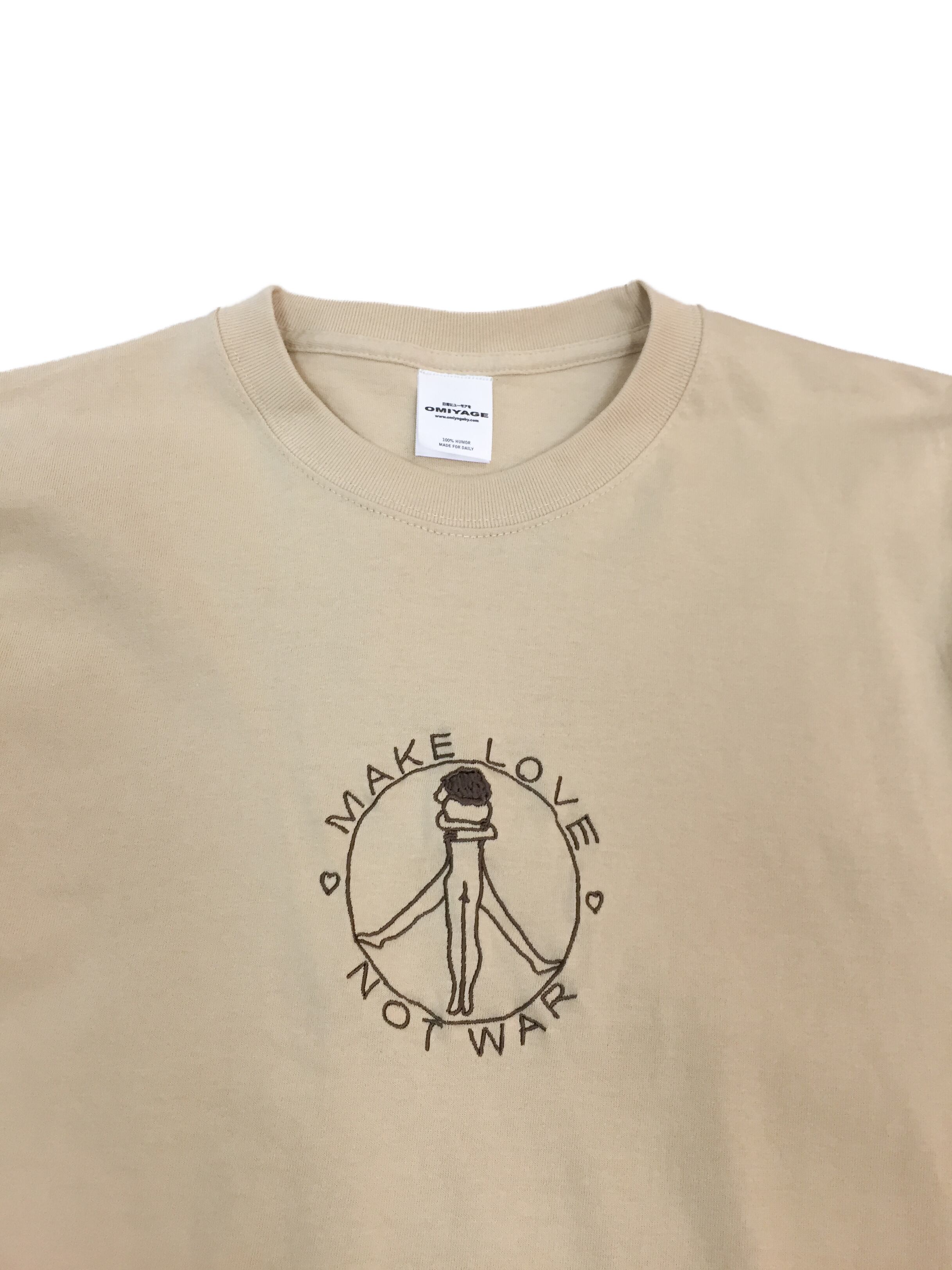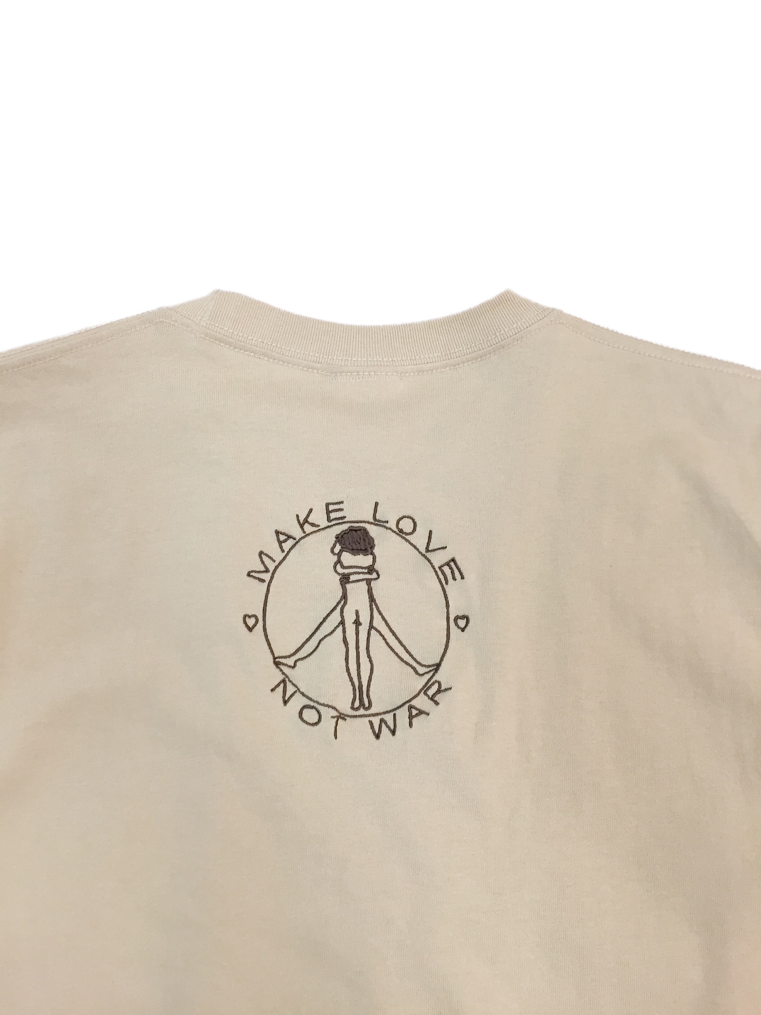 男女の裸体でピースマークを表現した落書きグラフィックを前後に刺繍されています。