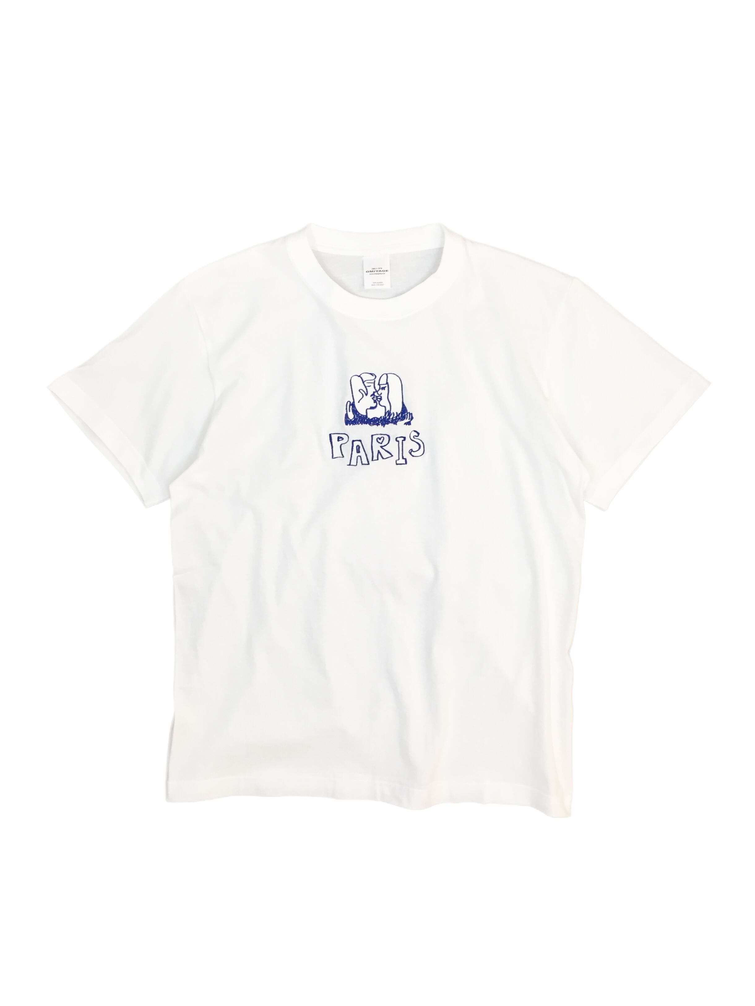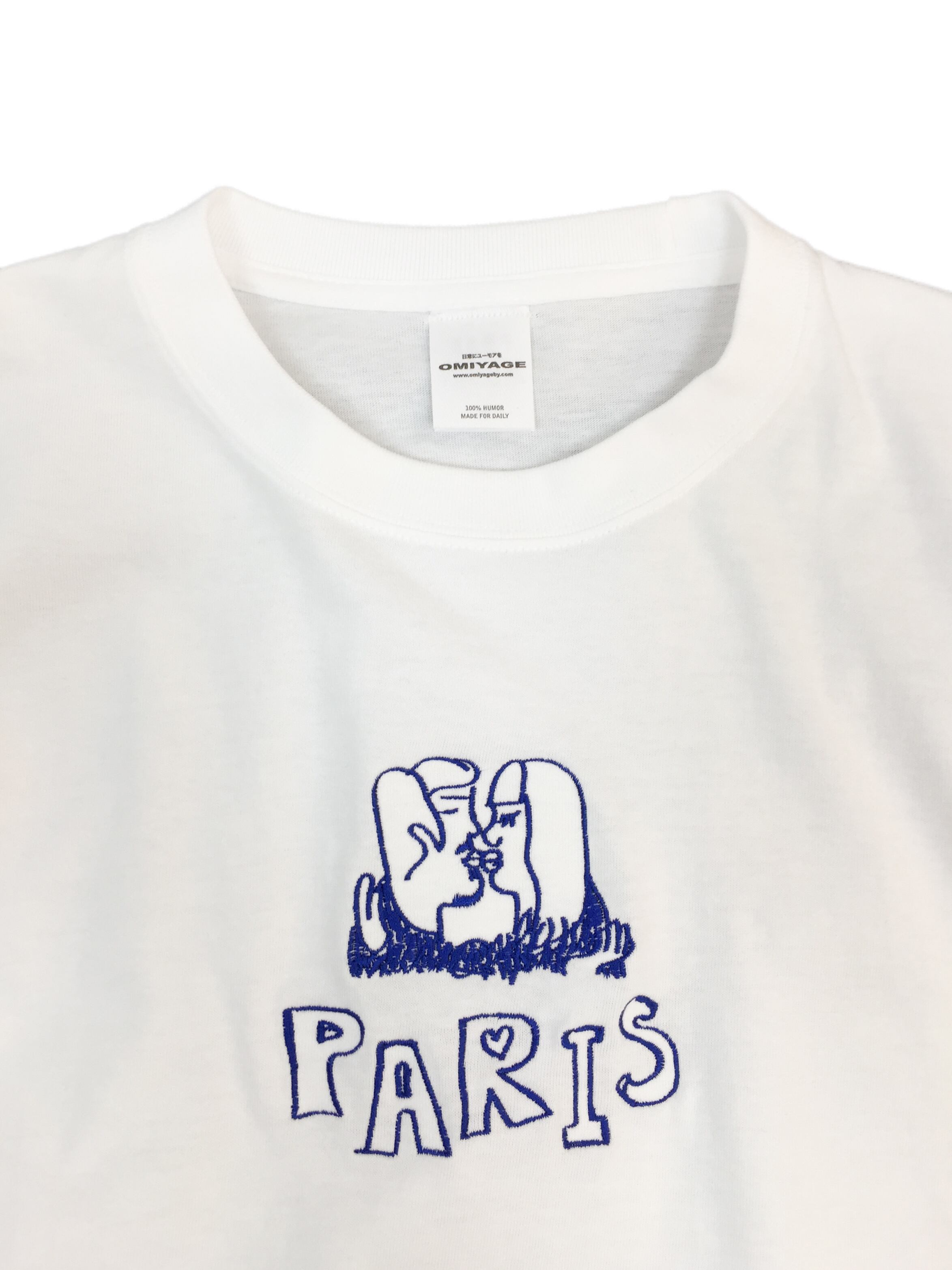 男女のキスとPARISの文字の粗い落書きが胸元に刺繍されています。